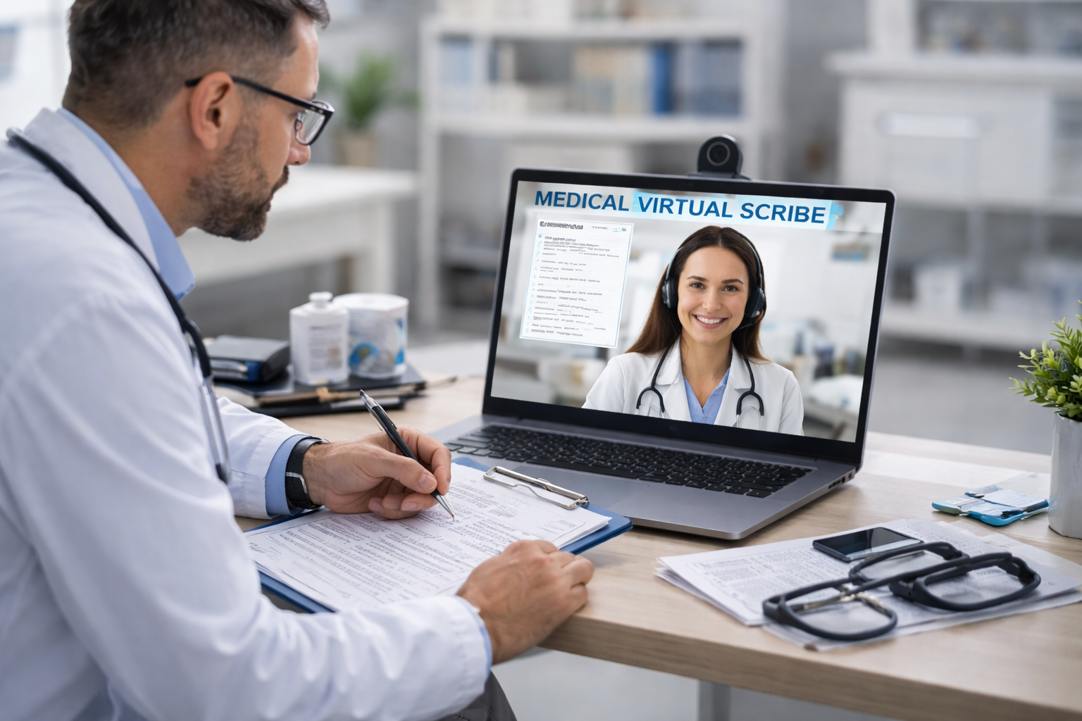 Virtual scribing is a process utilizing trained documentation specialists that listen to the encounter of patients remotely and prepare comprehensive medical records in real-time. They do not occupy exam room space because, unlike traditional in-room scribes, these professionals operate with secure audio-visual links recording the visit as it occurs without having to occupy space in the room.
